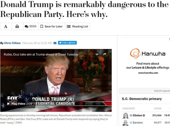 美国《华盛顿邮报》28日刊发“特朗普对共和党极度危险”的文章称,特朗普成为共和党总统候选人的胜率越来越高,但此举对共和党来说不是什么好事,反而十分糟糕。特朗普强硬的移民政策(遣返移民、边境筑墙等)已使得使得共和党束手无策,但其更大的危险是,特朗普具有极端的不可预测性,他似乎更愿意说出一些惊爆眼球的言论,而且以莫名其妙地、强硬的、毫无悔意的方式说出。