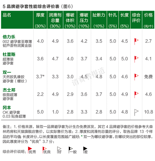 综合性能指标测试结果,本刊对5品牌避孕套进行性能评价排名。电商上颇受欢迎的国产品牌倍力乐性能较佳,其次是杜蕾斯,而冈本相对较差。(如图6)
