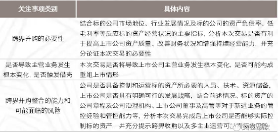 就跨界并购而言,除传统的标的合规性、交易对方资金来源及结构、标的财务数据及经营业绩、标的估值、业务协同及整合等传统并购关注要点外,结合跨界并购的特点,监管特别对以下问题重点关注: