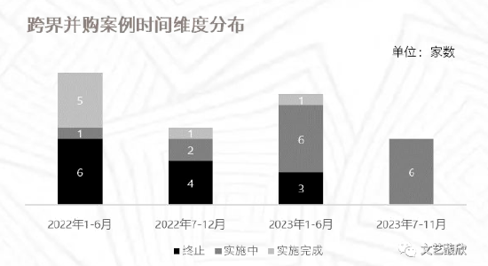 我们将2022年以来的时间分为2022年1-6月、2022年7-12月、2023年1-6月、2023年7-11月四个阶段来观察这四个阶段内首次公告的跨界并购案例进展情况,来看看整体是否有收紧迹象。