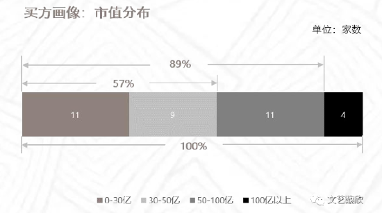 以首次披露交易公告前一交易日总市值按30亿元、50亿元、100亿元为指标划分,进行跨界并购的上市公司市值30亿以下的为11家,30-50亿元的为9家,50-100亿元的为11家,100亿元以上的为4家。50亿以下的小市值上市公司跨界并购占比为57%,100亿市值以下的中小市值上市公司跨界并购占比则为89%,多数跨界并购买方为中小市值上市公司。