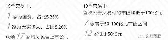 此外,我们再对上述19单交易的买方情况进行画像,其中只有1家为国资占比5.26%,1家属于无实控人,占比5.26%,其余买方均为民营上市公司。