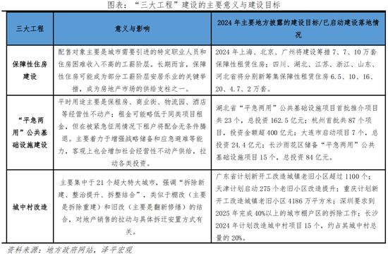 “三大工程”建设蓄势待发,支撑房地产投资,以进促稳。保障性住房、城中村改造、“平急两用”公共基础设施在内的三大工程建设,将在2024年进一步支撑市场需求和投资开工。其中,保障性住房未来作为与商品房并行的“双轨”之一,无论是新建还是收购存量房作为保障性用途,对房企都是好消息。房票安置配合“城中村改造”,可以扩大现有住房业务业态,增加房屋建设及后续的物业管理的业务空间。“平急两用”基础设施建设也新增了大量公建及城市空间服务的需求。配合PSL新增落地、专项债、商业银行配套资金等多渠道支持,2024年“三大工程”实物工作量有望提升,支撑市场需求和投资开工。