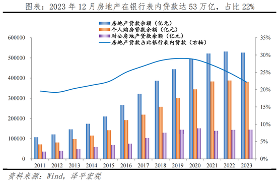 2023年12月,房地产银行信贷余额达53万亿,存量占比22.2%。呈现体量庞大、占比见顶、增速放缓特征。房地产对银行信贷占用体现为对公房地产贷款和个人住房按揭贷款。总体来看,截至2023年12月,房地产对银行信贷占用余额达52.6万亿,占银行贷款比重22.2%,较2019年顶峰时期下降了6.7个百分点。结构来看,对公房地产开发贷14.4亿元,个人住房贷款38.1亿元,占银行贷款比重分别在2018年、2020年见顶,随着“三条红线”“贷款两集中”政策出台,2023年12月分别回落至6.1%、16.1%。