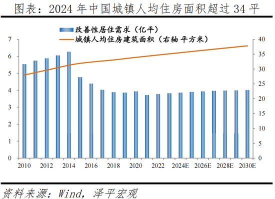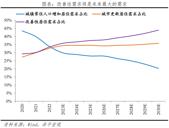 我们连续6年在《中国住房存量报告》系列中跟踪研究发现,综合考虑城镇化进程、改善性需求、城市更新等,中国房地产市场未来需求下降,但中长期仍有发展空间。根据我们测算,2024-2030年年均新增城镇居住需求约10.0亿平,相较2011-2023年年均新增城镇居住需求的11.3亿平有一定下降,2030年我国居住总需求或将降至9.1亿平。2024年我国年新增城镇居住需求约10.6亿平,城镇常住人口增加(剔除行政区划变动,后同)、居住条件改善、城市更新需求分别占总需求的28.8%、34.5%、36.7%。未来六年,改善性需求总量、占比均呈现逐年增长趋势,2023年开始预计超越城镇常住人口增长带来的需求成为最大的需求。