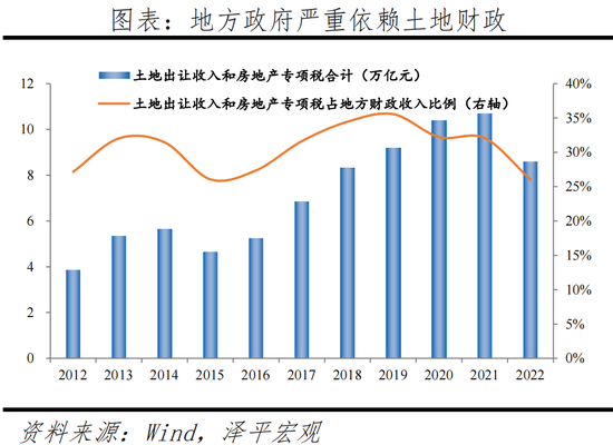 在土地财政制度设计中,地方政府依赖土地财政,房地产的直接税收及土地出让收入贡献可观。2022年土地出让收入和房地产专项税合计占地方财政收入的26.0%,地价占房价5成左右。近两年受经济下行周期影响,地方政府土地财政空间持续收缩,2023年的国有土地使用权出让收入是5.8万亿元,跌破6万亿大关,同比下降13.2%,相比2021年高点的8.7万亿元少了2.9万亿。