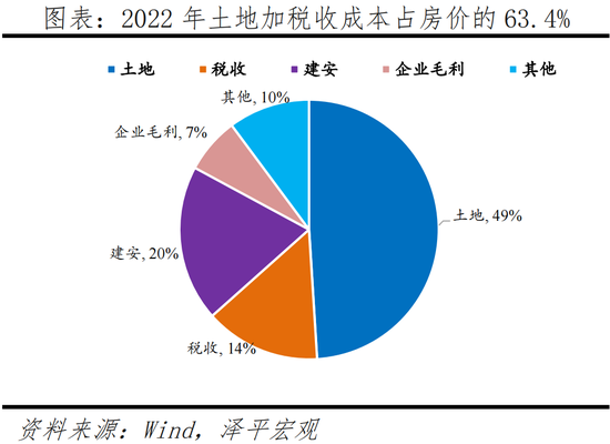 从中观城市看,选取北京、上海、广州、深圳、杭州、天津等11个城市进行房价构成核算。2022年,土地成本占房价的49.0%,税收成本占14.4%,建安费用占比19.5%,企业毛收入为7.0%,土地成本加税收成本占房价的5成左右。将2014-2022年房价增速对土地价格增速进行回归之后发现,土地价格每提高一个百分点,房价提高0.2个百分点,且土地成本上涨对房价上涨解释力很强。