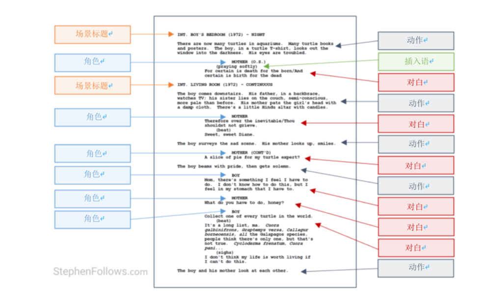 场景标题——列出即将发生的场景所在位置,有时还会注明是白天还是晚上。INT表示室内场景,EXT表示室外场景;