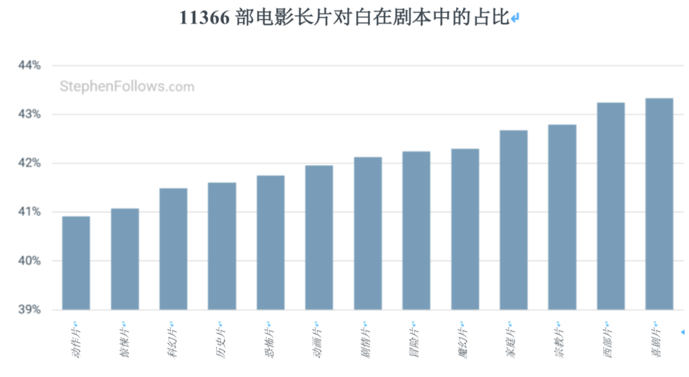 不同类型的电影,内容有什么不同?从理论上来说,“我爱你”和“去死吧”的剧本页面长度和播放时间是一样的。事实上,某些类型的影片比其他类型的台词或对白更长或更频繁。下图显示的是对白在剧本中所占的比例。与上图有相似之处(动作片和喜剧片分别处于两端),也有不同之处(剧情片和恐怖片在两张图中的位置相差很大)。