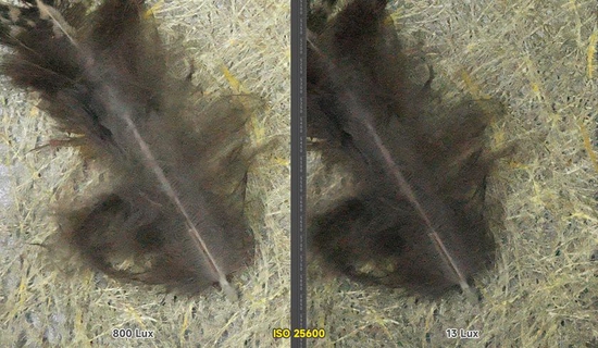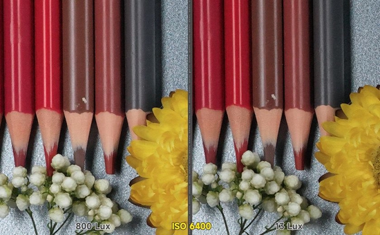 在ISO6400下,两挡亮度下的画质表现很接近,而在最高感光度ISO25600时,13Lux下画质会进一步下降。