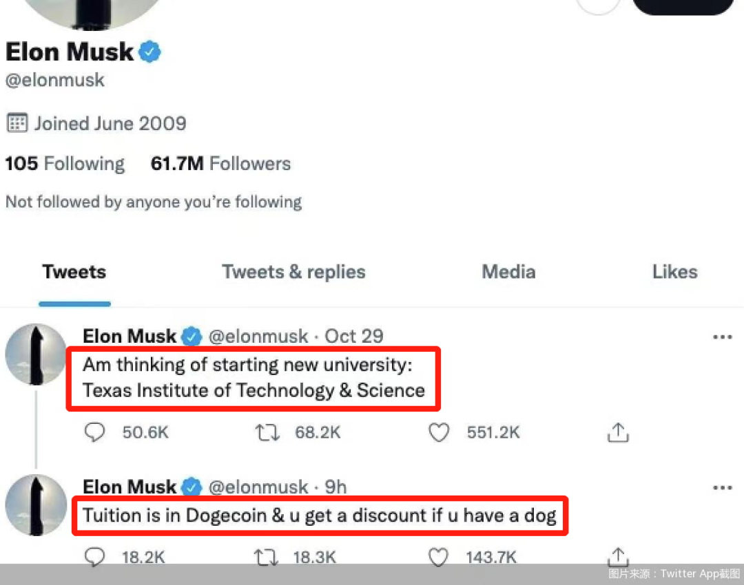 11月1日,马斯克发布推特称计划在德克萨斯州建造一所大学,名为德州理工学院,并称该大学的学费将接受狗狗币支付,如果是养狗者还可以享受折扣。